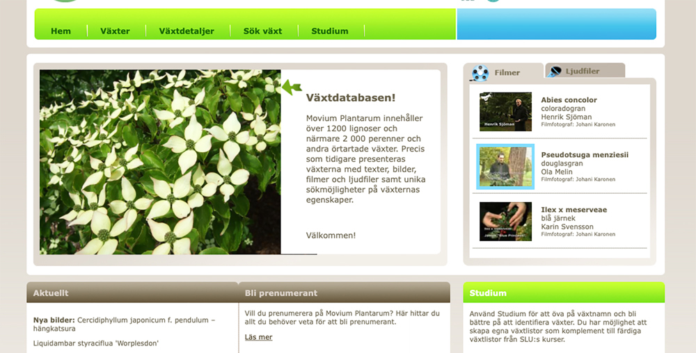 En växtdatabas för studenter och professionella växtanvändare. Movium Plantarum innehåller över 1 200 lignoser och närmare 2 000 perenner och andra örtartade växter. Växterna presenteras med texter, bilder, filmer och ljudfiler samt unika sökmöjligheter på växternas egenskaper och möjligheter till självstudier.